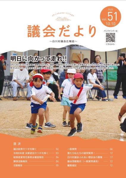 今後も議会の公正かつ円滑な運営に努め、執行、行政と共に、輝く白川村づくりのために是々非々の姿勢で取り組んでまいります。関係皆様の温かいご指導をお願いし、議長就任の挨拶とさせていただきます。