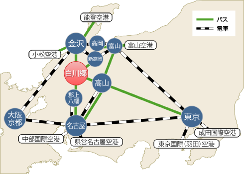 最終更新日:2018年02月07日 公共交通機関を利用する場合 公共交通機関を利用した白川郷へのアクセスは、名古屋、金沢等の電車駅からバスのご利用となります。 ※白川郷内のバス停は、2016年10月1日から荻町北側(荻町信号交差点)の「白川郷バスターミナル」に変更となりました。 ※白川村の位置についてはこちらをご覧ください。