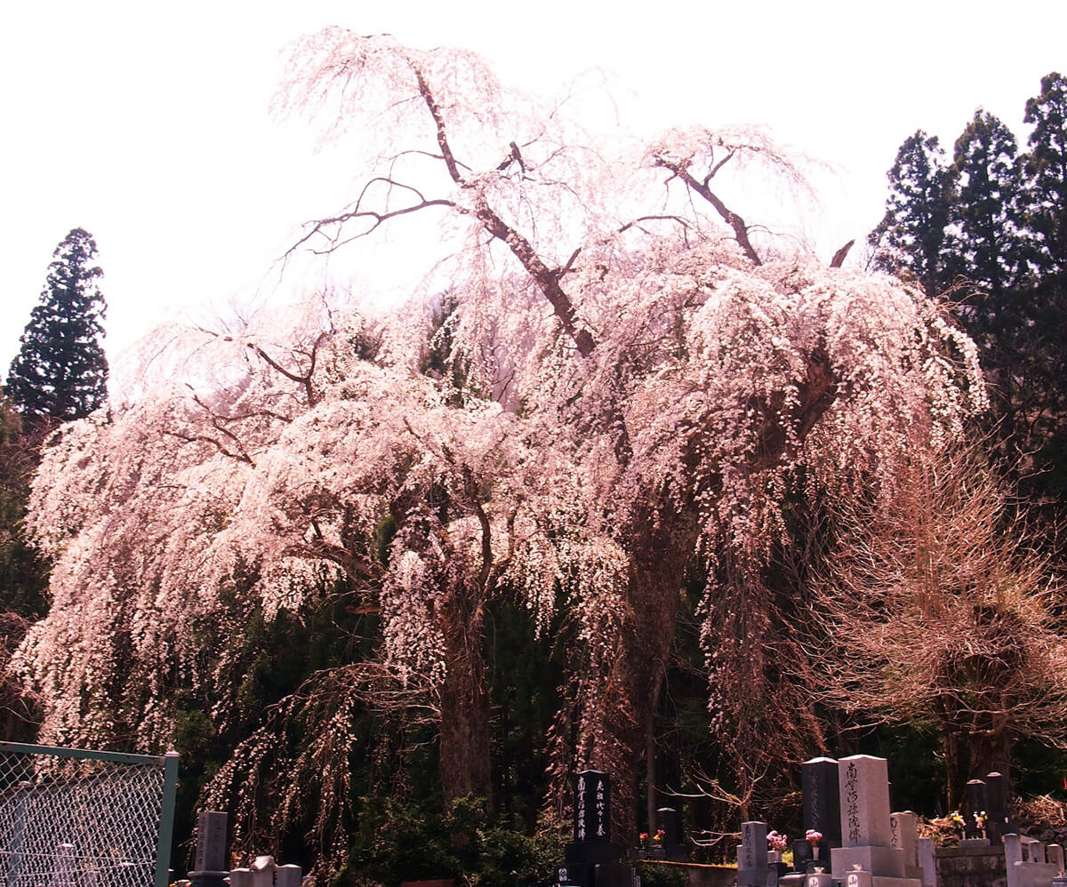 The twin weeping cherry trees that tower over the cemetery at Jotokuji Temple are between 250 and 300 years old, and their blooming in late April traditionally served as the signal to local farmers that it was time to prepare for the growing season. The flowers usually coincide with the April 25 commemoration of the death of Rennyo (1415–1499), a major figure in the Jodo Shinshu (True Pure Land) school of Buddhism that was deeply influential in Shirakawa-go. On that day, local devotees would traditionally memorialize Rennyo by gathering underneath the cherry blossoms at Jotokuji.