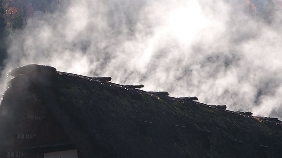 秋天的清晨,可以看到合掌造茅草屋顶冒出白色烟雾。