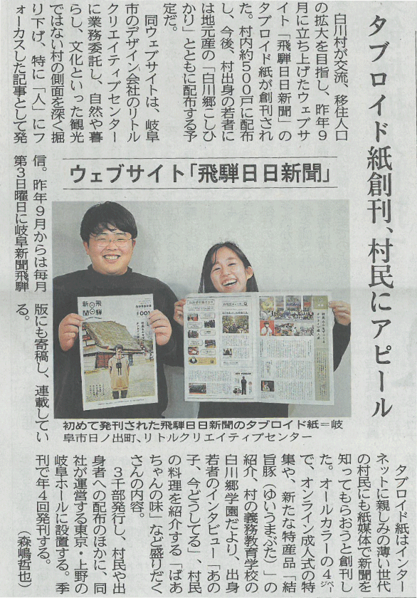 2021.01.07 岐阜新聞に掲載されました! あけましておめでとうございます! 岐阜新聞飛騨版にタブロイド版の創刊を取り上げて頂きました! 2021年1月7日付けの岐阜新聞飛騨版をぜひご覧ください。 一覧へもどる