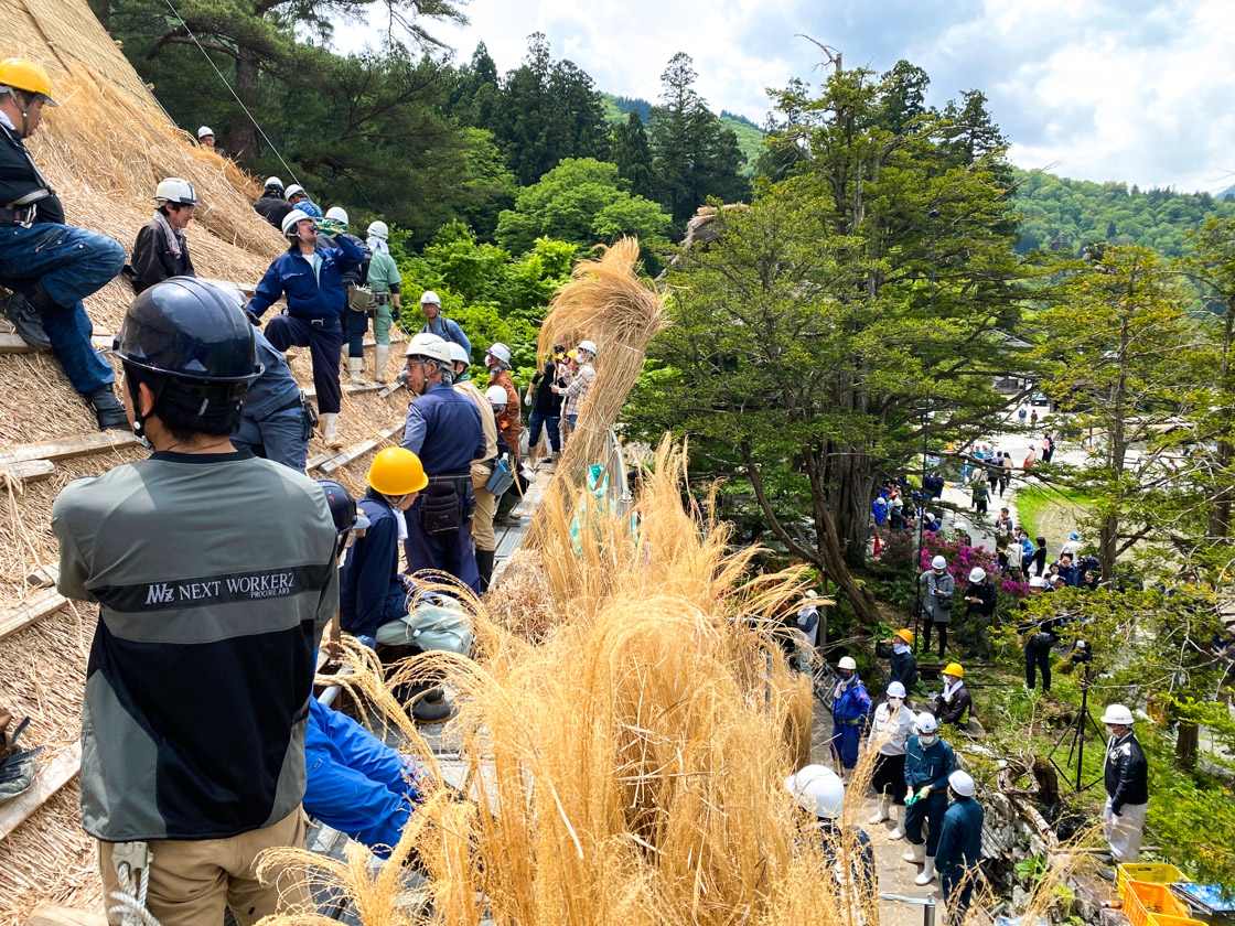 「合掌造りの屋根は30~40年に一度、老朽化に伴い屋根の葺替(ふきかえ)を行う必要があります。葺替には大量の茅を確保しておかなければなりません」。